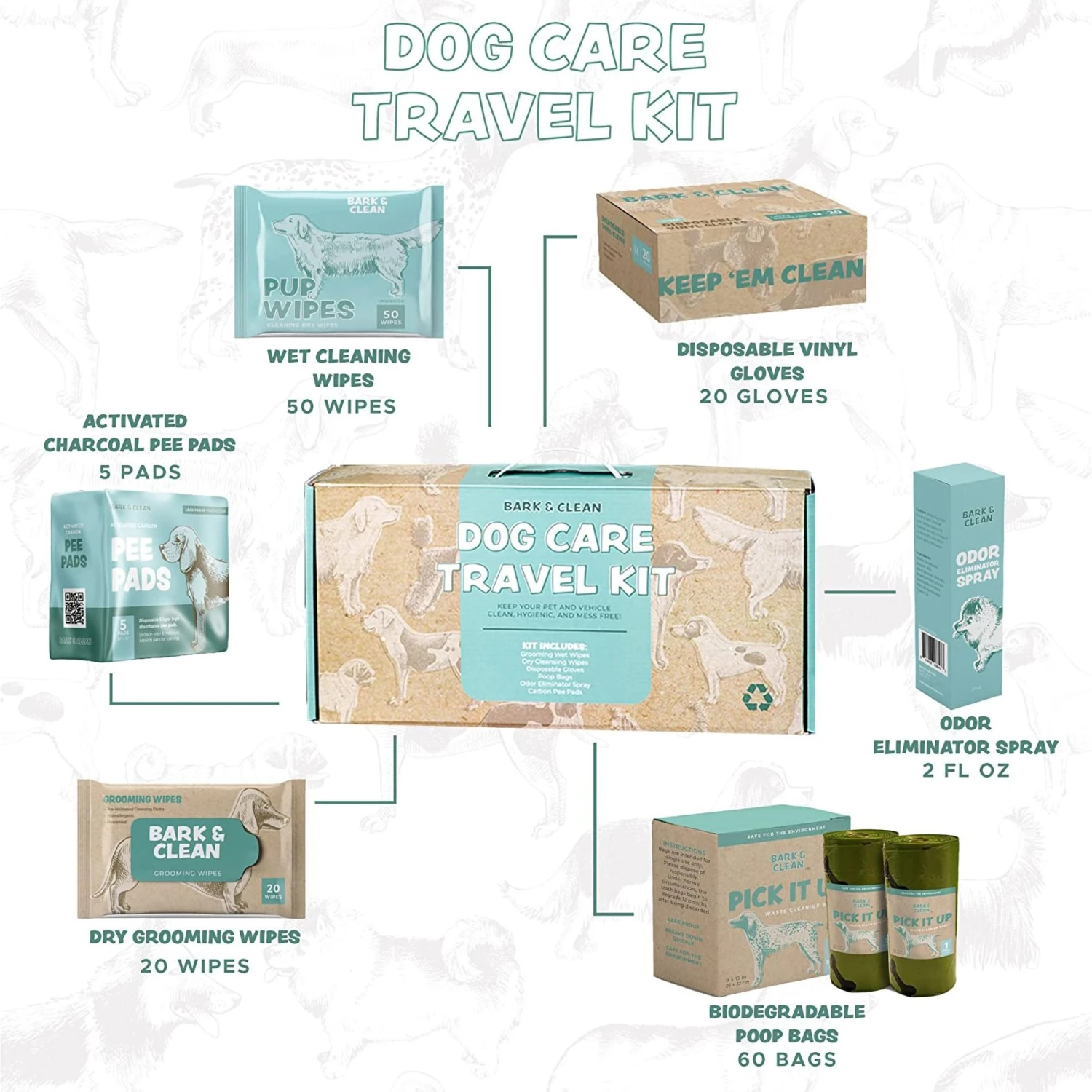 - Dog travel essentials kit includes dry wipes, grooming wipes, poop bags, pee pads, vinyl gloves and odor spray.
