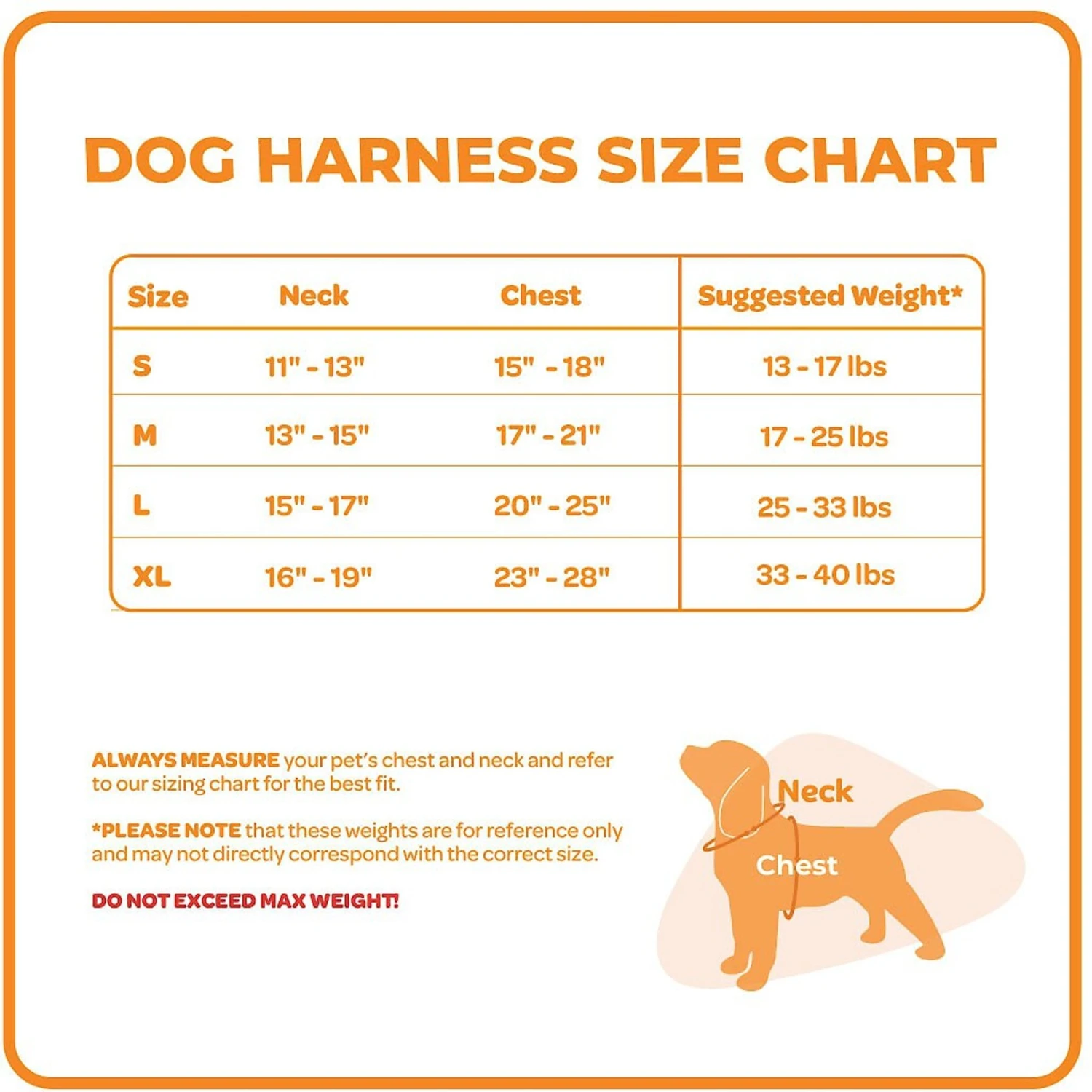 - Safety harness evenly distributes pressure around the chest to help prevent stress and strain on your pet’s neck.