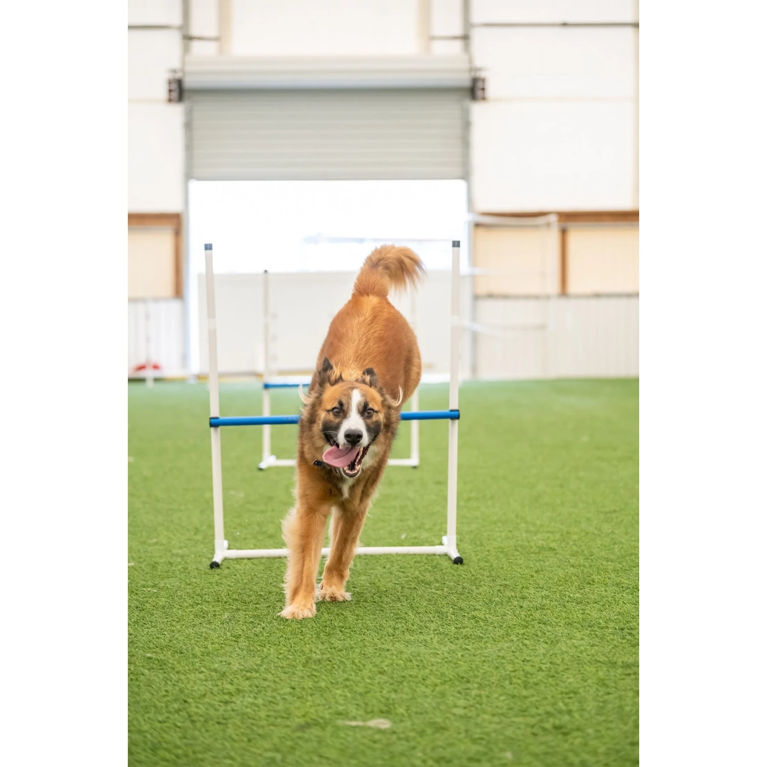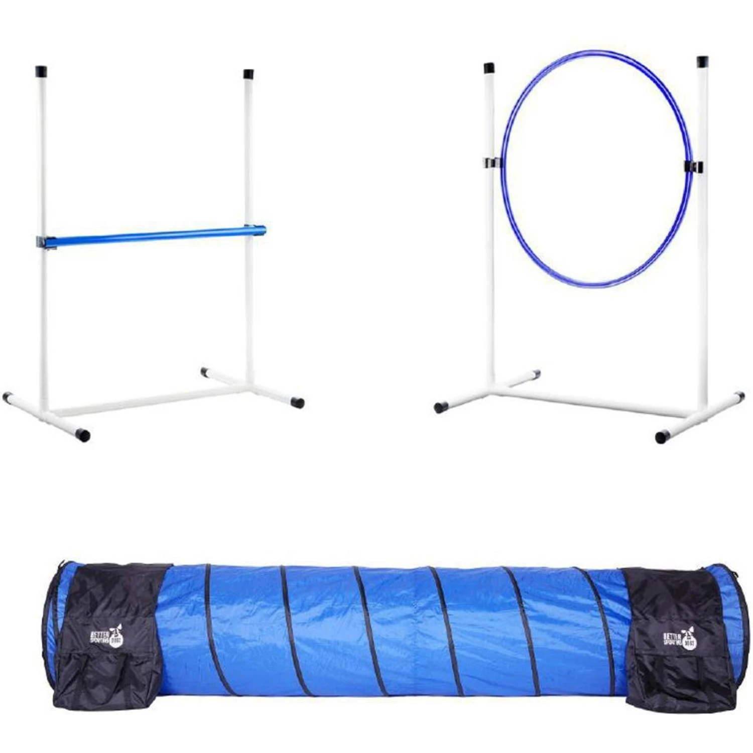 - Agility training course for dogs that includes an adjustable bar jump, an adjustable tire jump, and tunnel with 4 sandbags.
