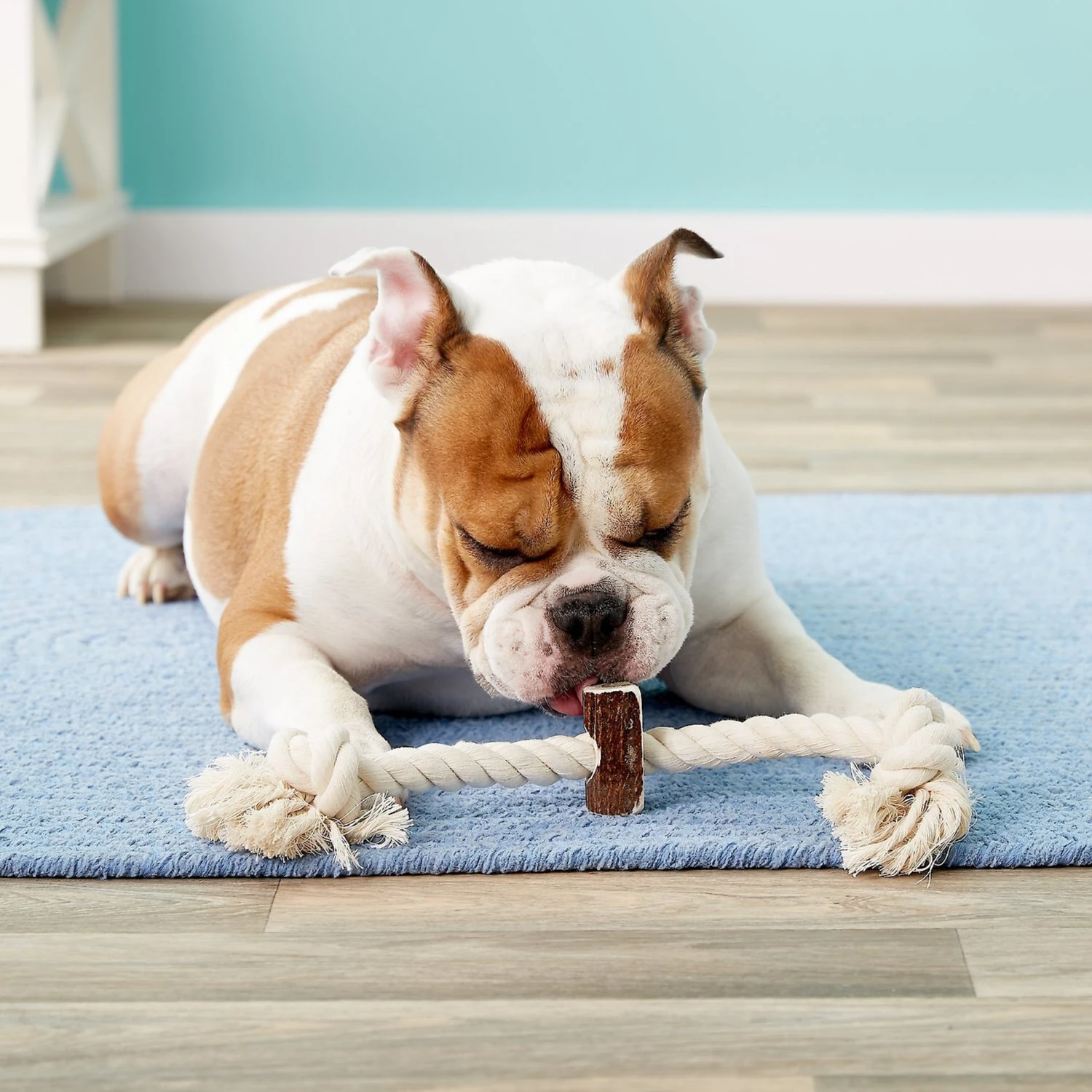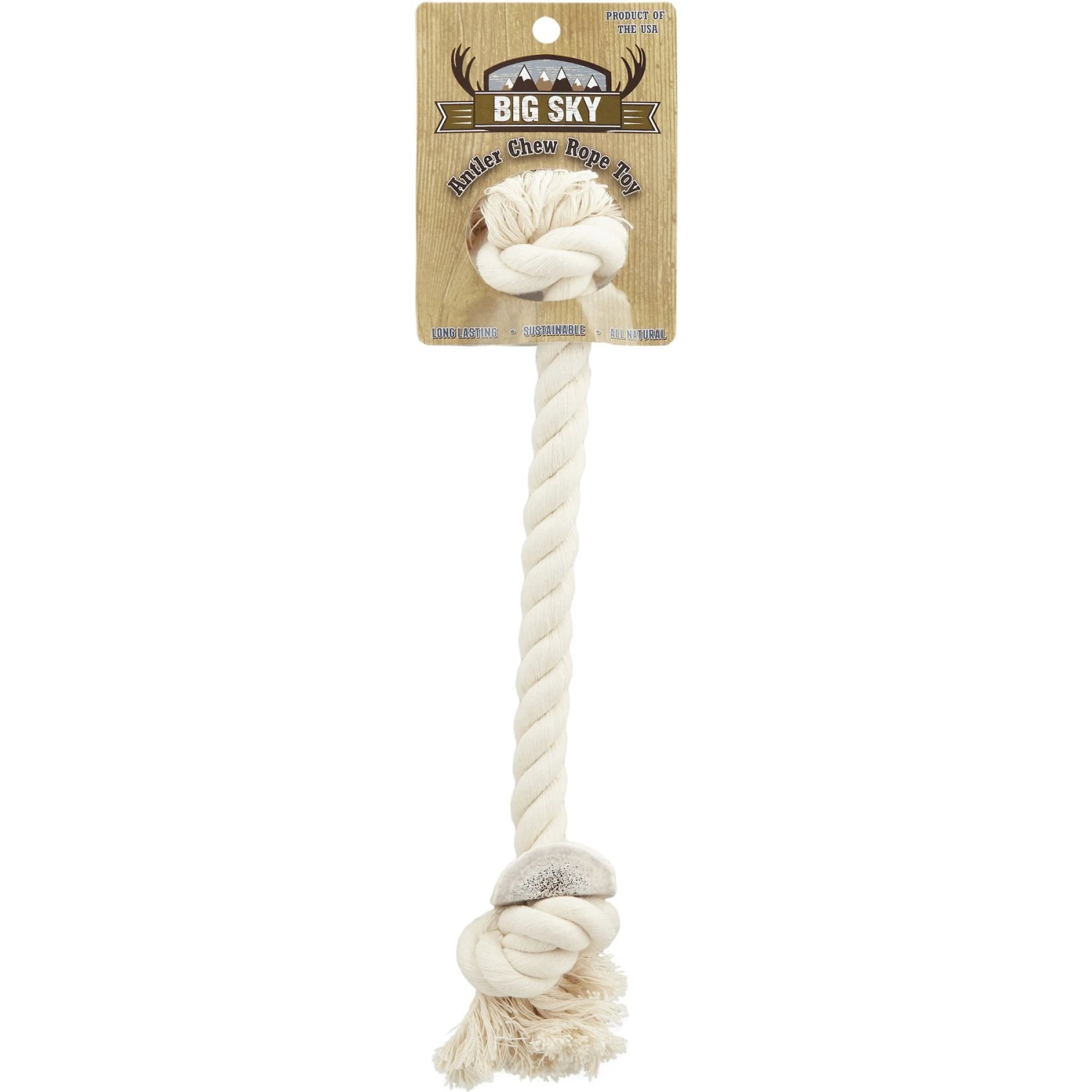 - Combines a section of elk antler attached to a 100% cotton rope with a knot at each end