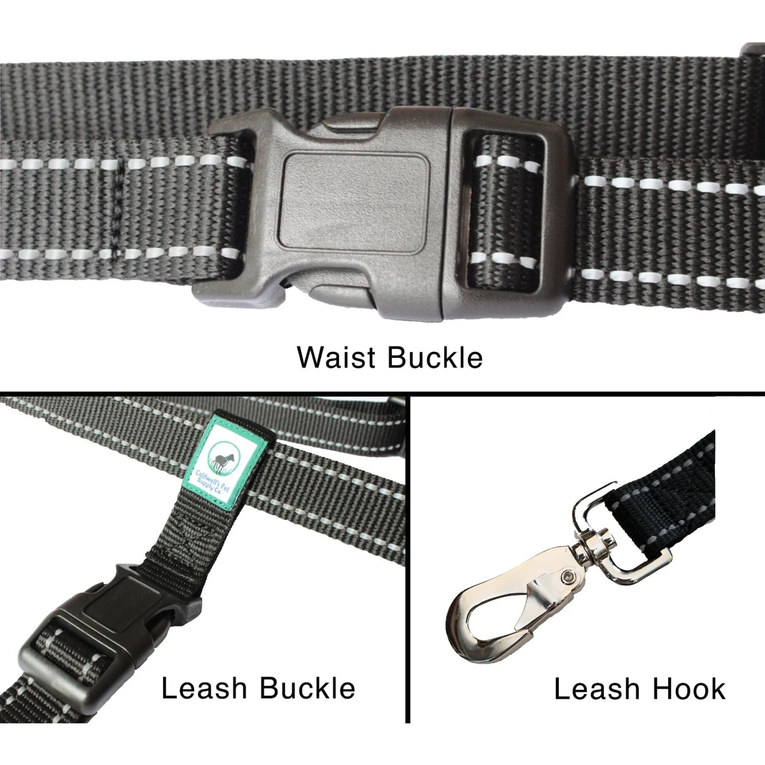 - This hands-free leash can be adjusted to fit around your waist and snaps shut with a quick-release buckle. You can also adjust the length of the lead for more control