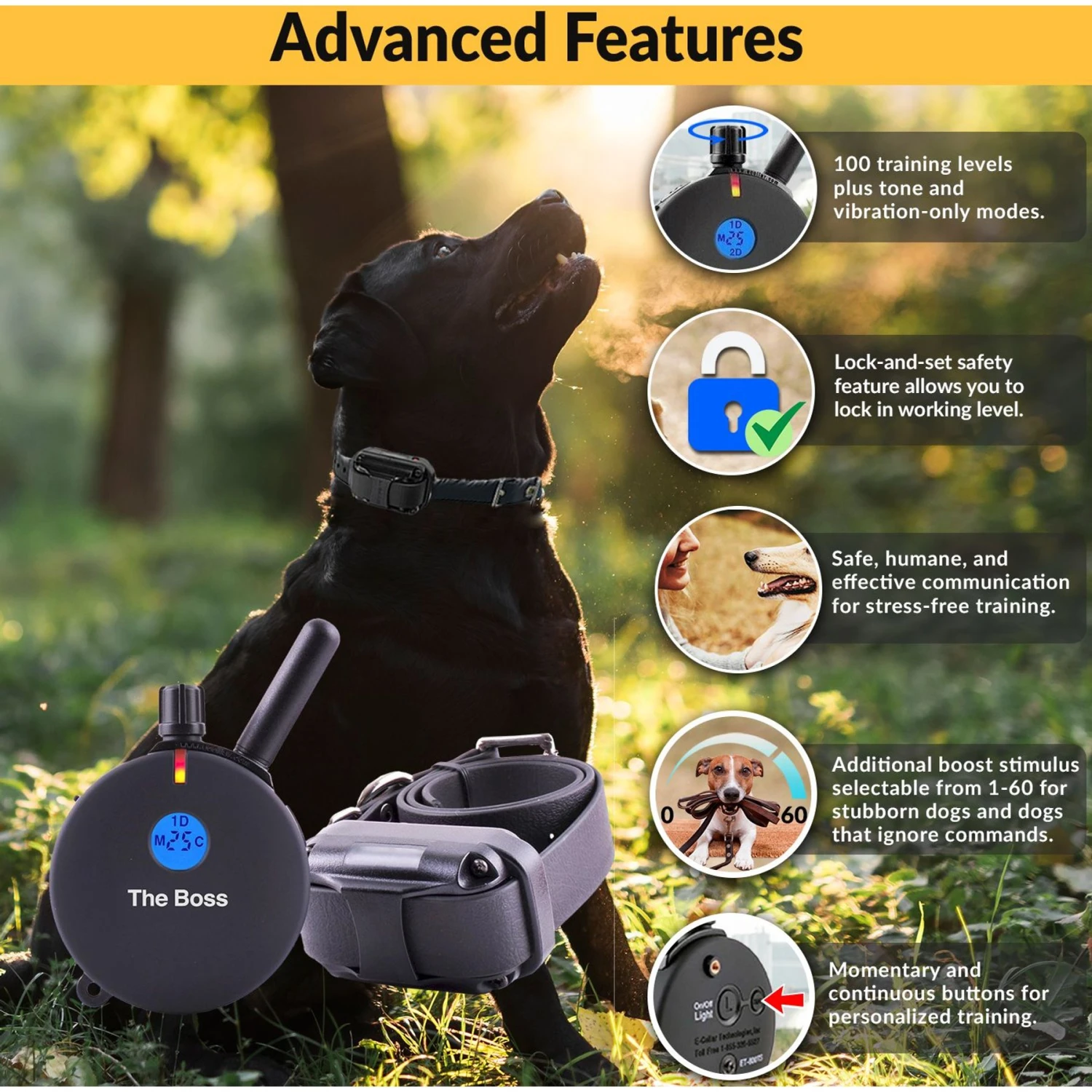 - Features “lock and set” stimulation levels from 1 to 100, and a boost level from 1 to 60, to match your individual dog’s temperament; 4-ounce receiver is suitable for any dog over 20 pounds.
