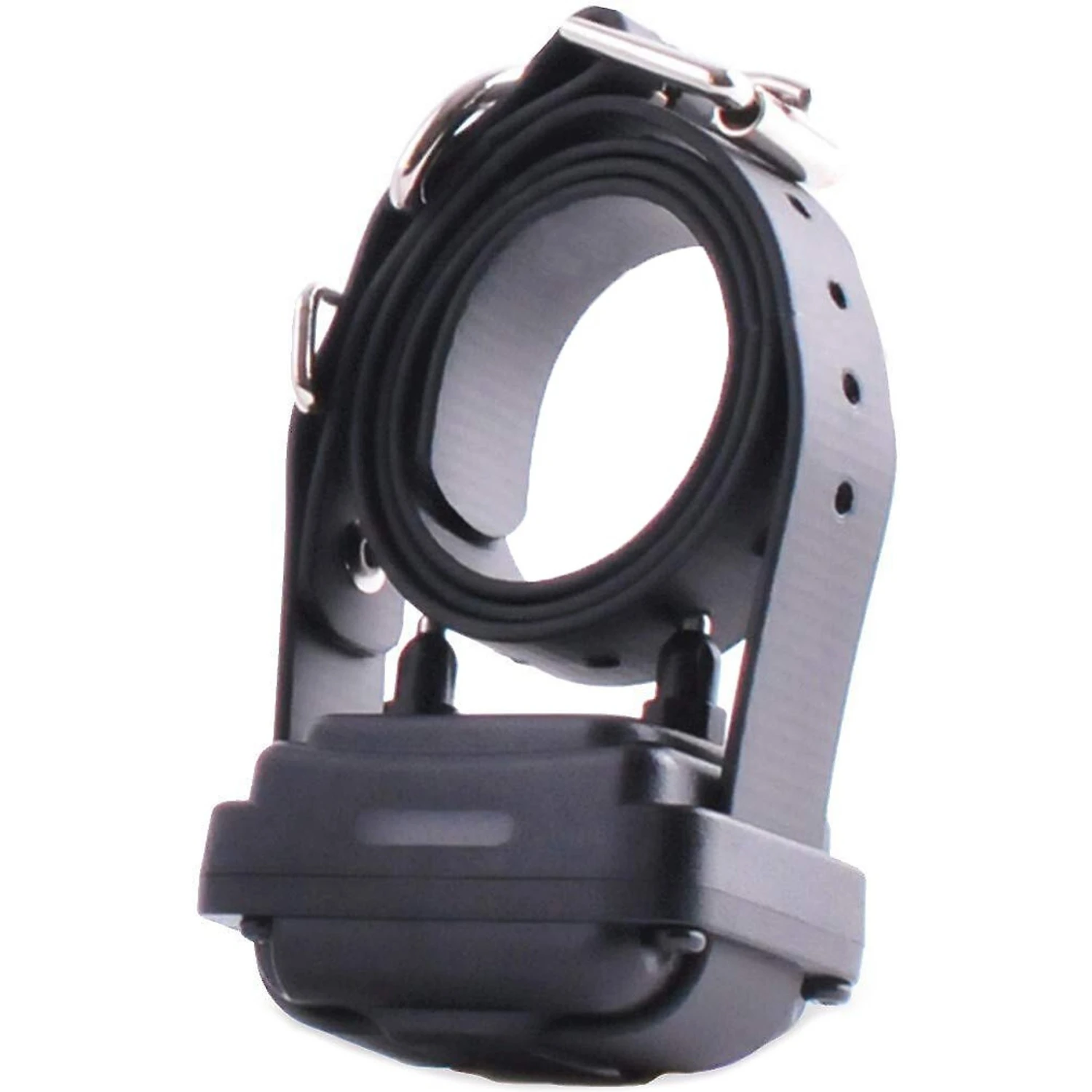 - The receiver is on a ¾-inch-wide black BioThane strap that connects around the neck.