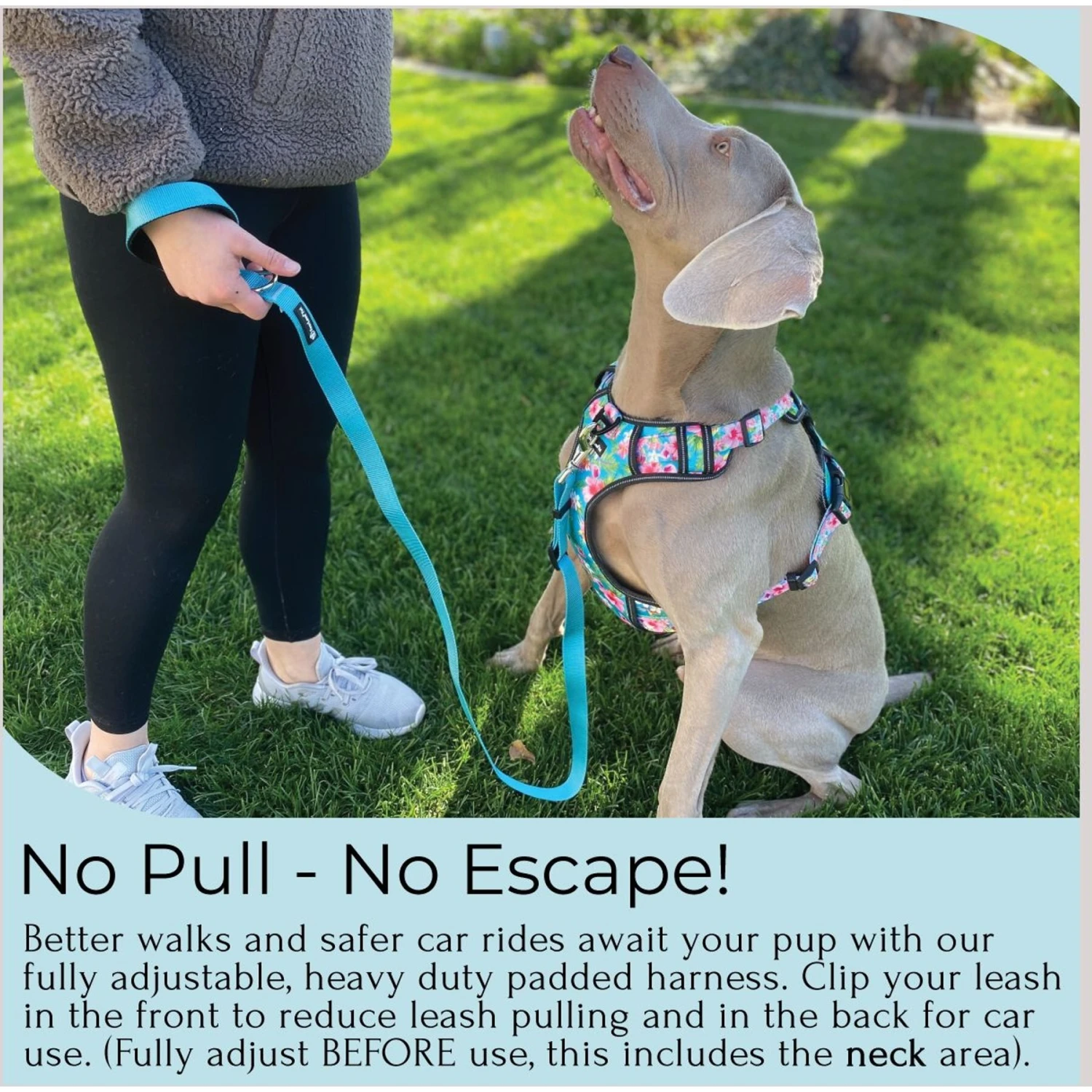 - Features a front clip that prevents leash pulling.
