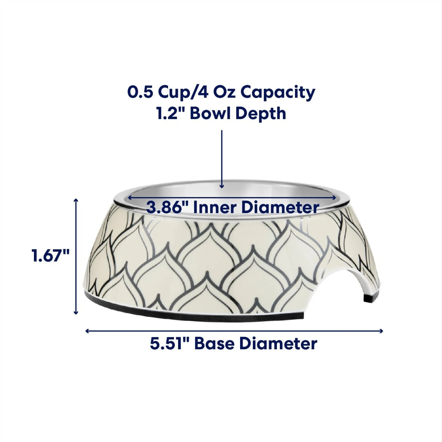 - Melamine base features a Moroccan print that elevates your dog’s dining experience.