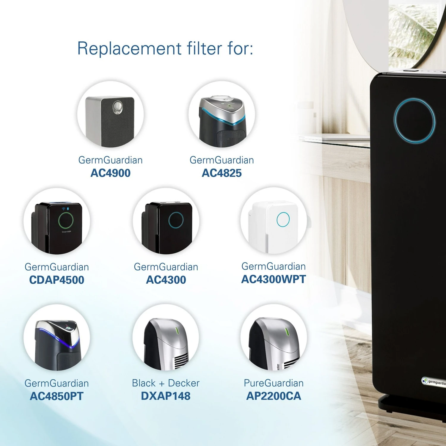 - Fits perfectly with GermGuardian Air Purifier models AC4900, AC4825, AC4850PT, CDAP4500BCA, CDAP4500WCA, AC4300BPTCA, AC4300WPT; PureGuardian model AP2200CA and Black+Decker model BXAP148.
