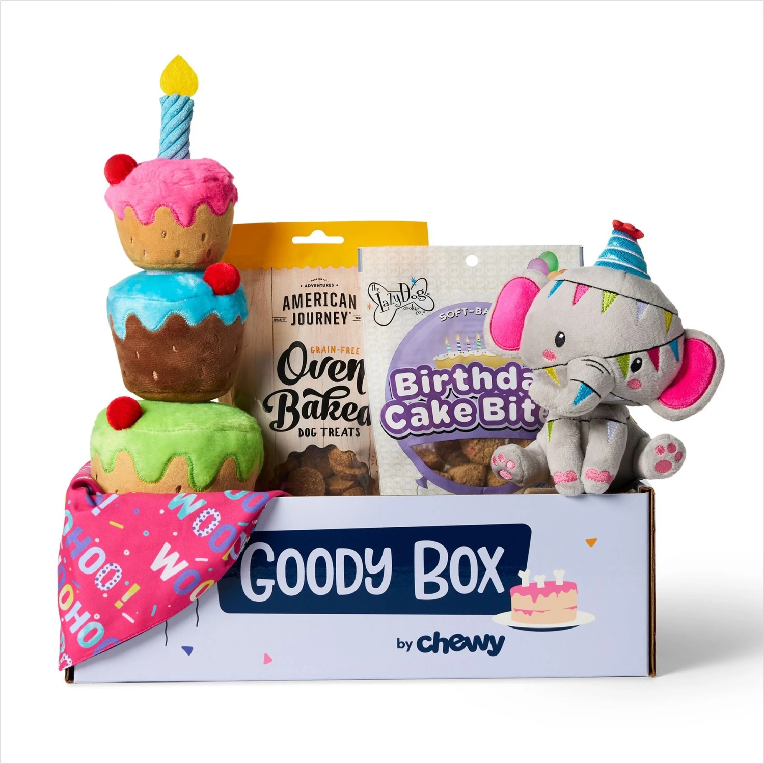 - Fun toys, tasty treats and a super-stylish hat? What more can you ask for? This limited-edition, BDay themed Goody Box comes with six items that’ll give your dog plenty of ways to enjoy the love on their special day.