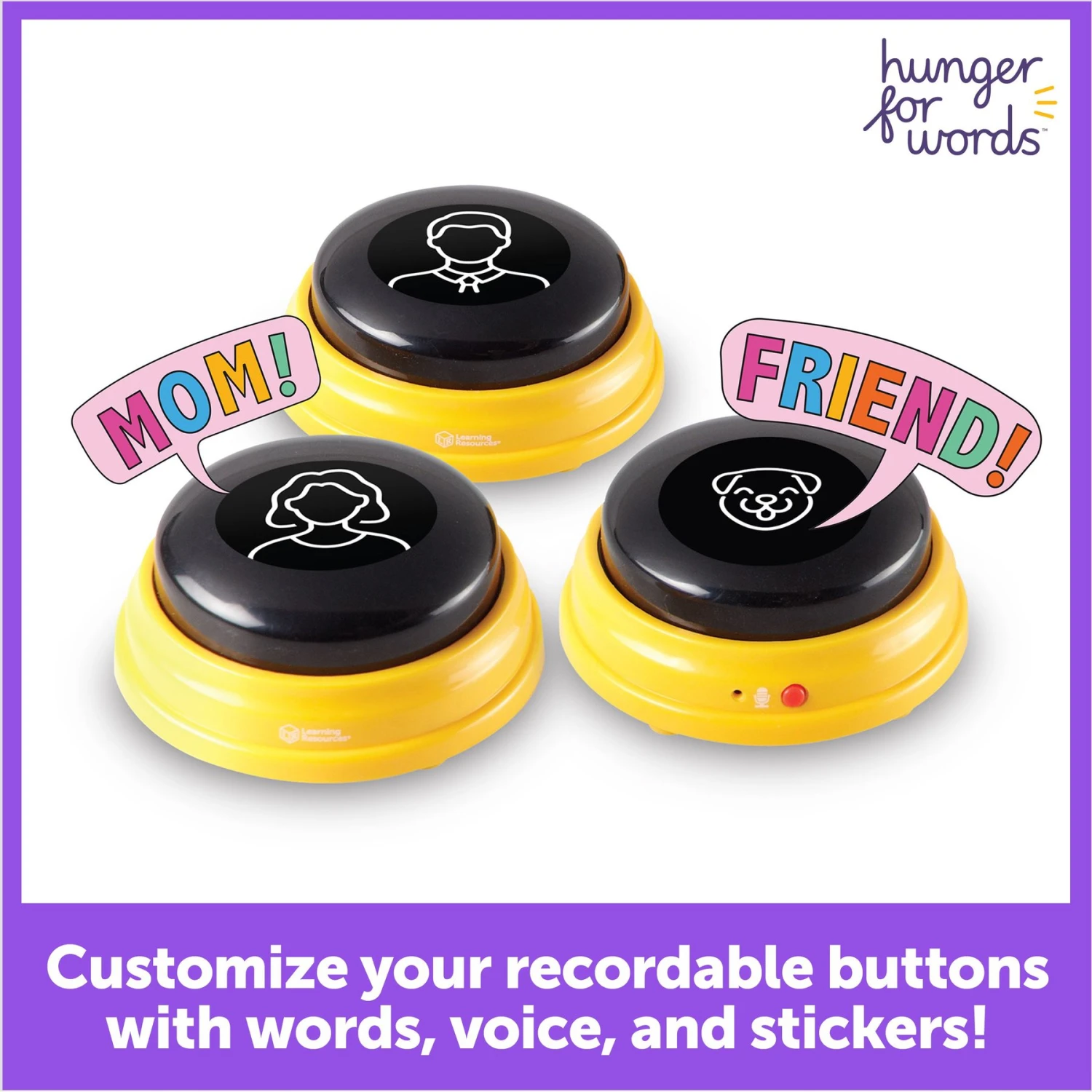 - Specifically designed to help teach three customizable naming words using three recordable buttons.