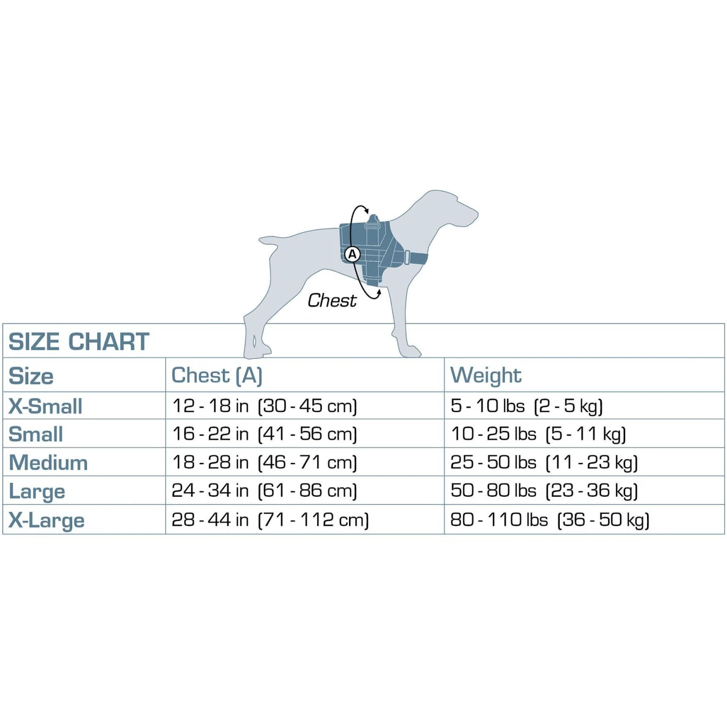 | Size | X-Small: 12 to 18-in chest, Medium: 18 to 28-in chest, Small: 16 to 22-in chest, Large: 24 to 34-in chest, X-Large: 28 to 44-in chest |