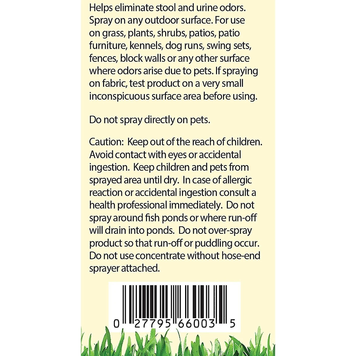 - Safe to use on grass, plants, shrubs, patios, kennels, dog runs, swing sets, fences, block walls or any other surface where odors arise due to pets.