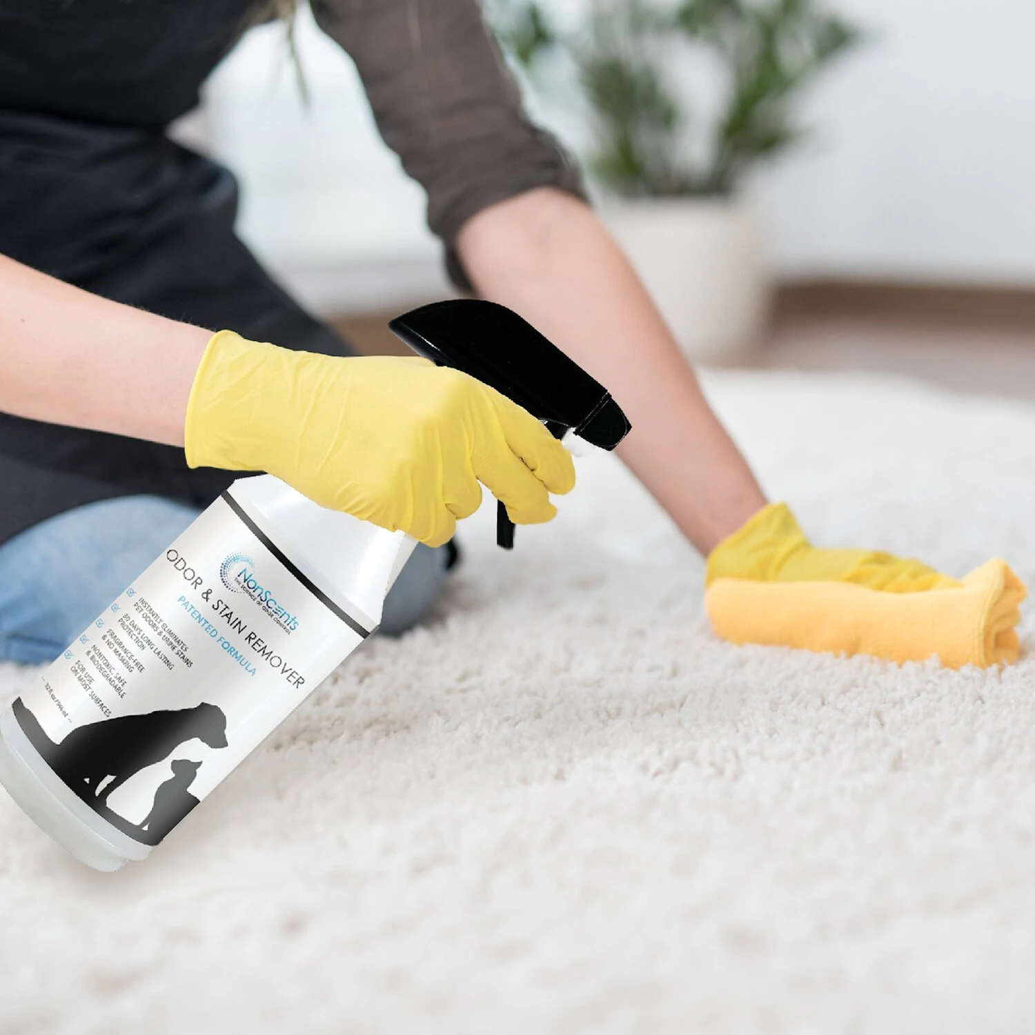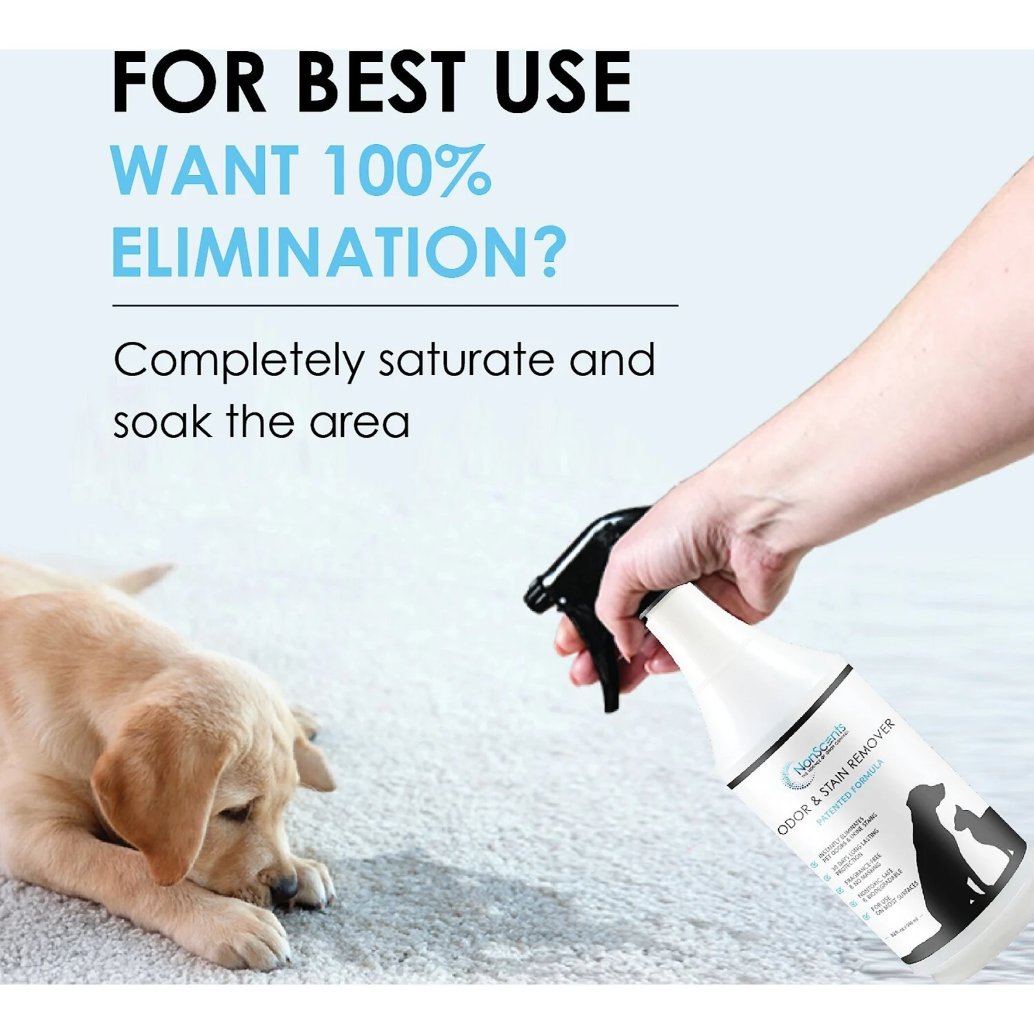 - Apply the spray to the stinky area, wait for 30 minutes and then blot dry.
