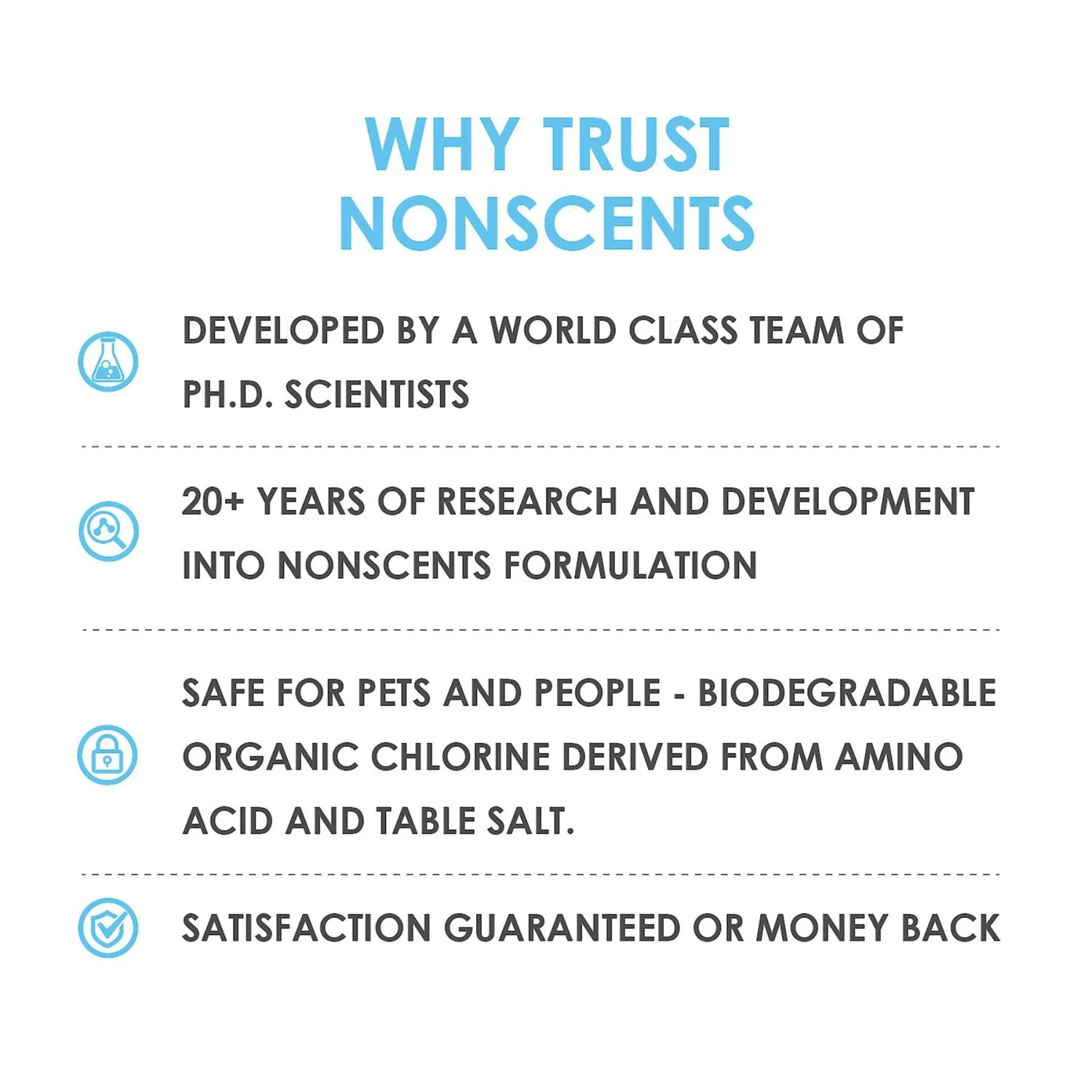 - Spray destroys odor compounds at the molecular level.