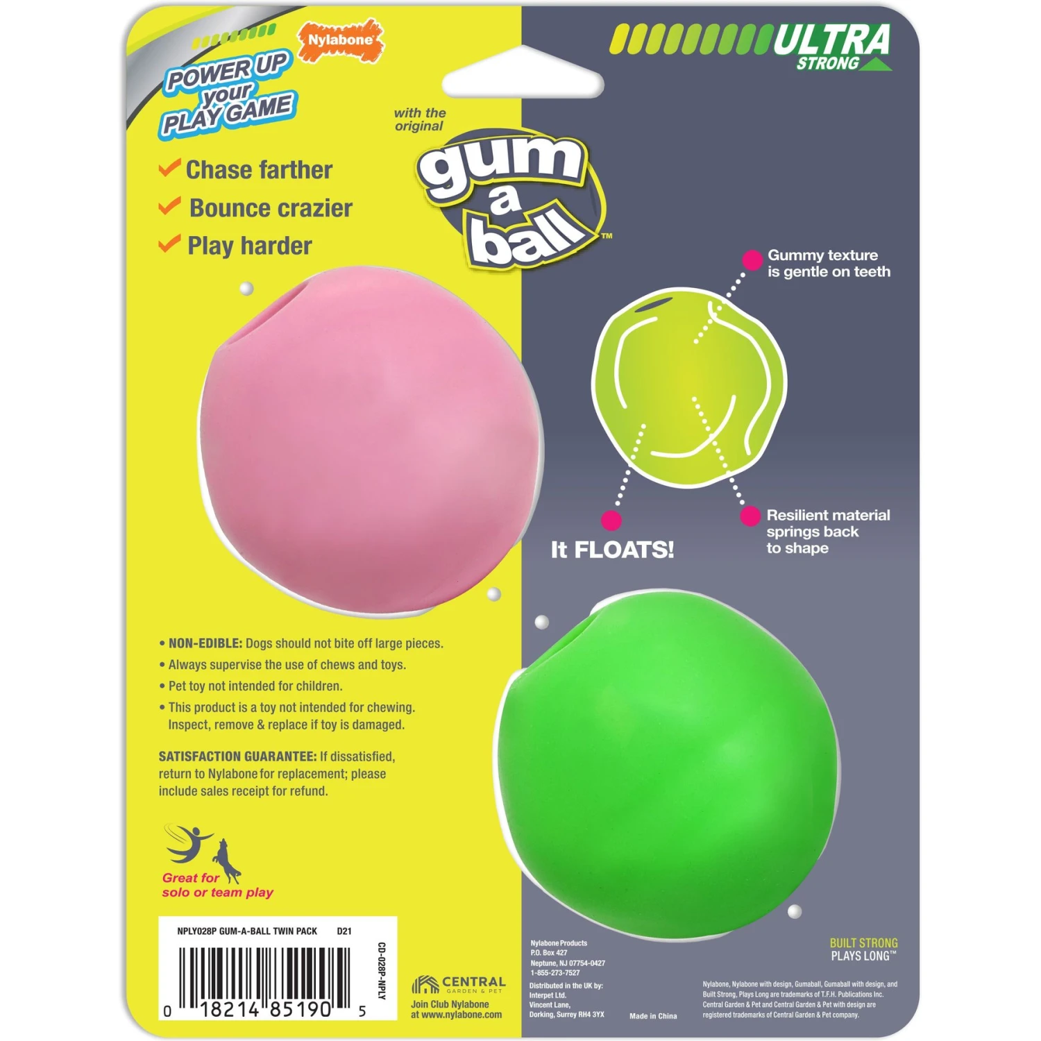 Power up playtime with Nylabone Power Play Gum-a-Ball Dog Toy! This toy is made with durable yet squishy materials, giving it a gummy texture that is gentle on your pup’s teeth. Its innovative design makes it virtually unpoppable, and its erratic bouncing makes it an irresistible addition to a game of fetch. Its bright color makes it highly visible during solo or group play, and it even floats for fun in the water! It is the paw-fect chew toy for gentle chewers or those with sensitive teeth.