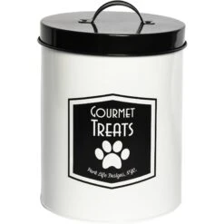 - The charming canister says, “Gourmet Treats” and “Park Life Designs, NYC” on the front and features a large white paw print.