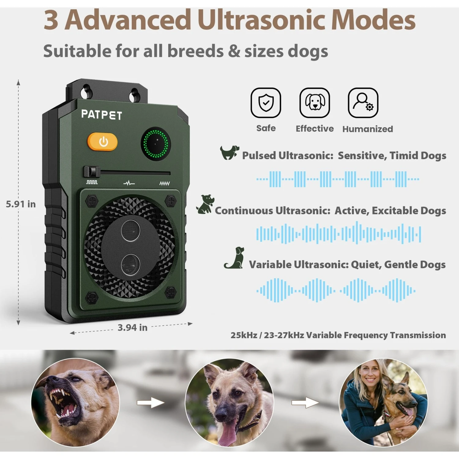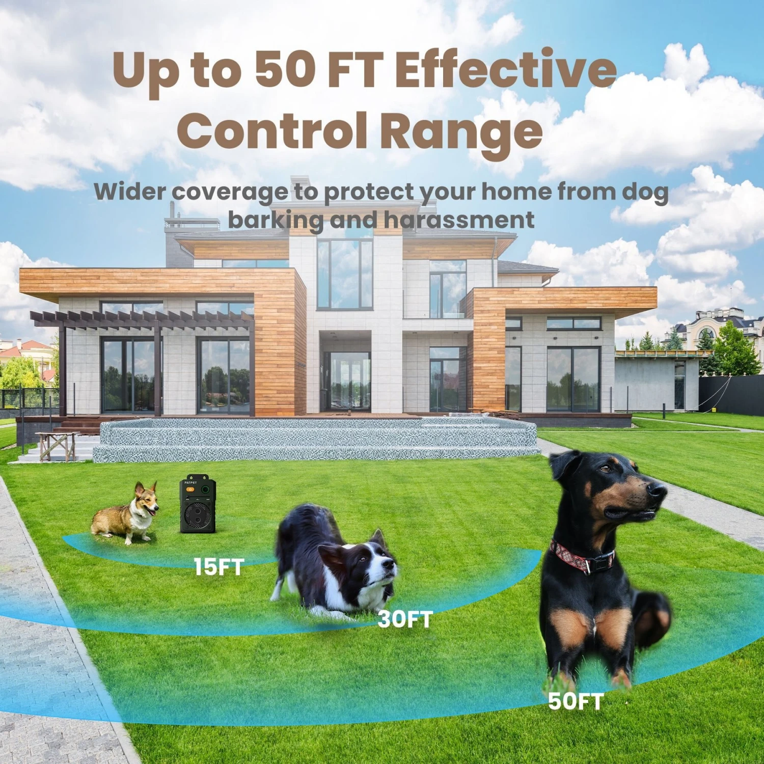 - Automatic barking detection, uses high-frequency ultrasonic sound to disrupt barking.