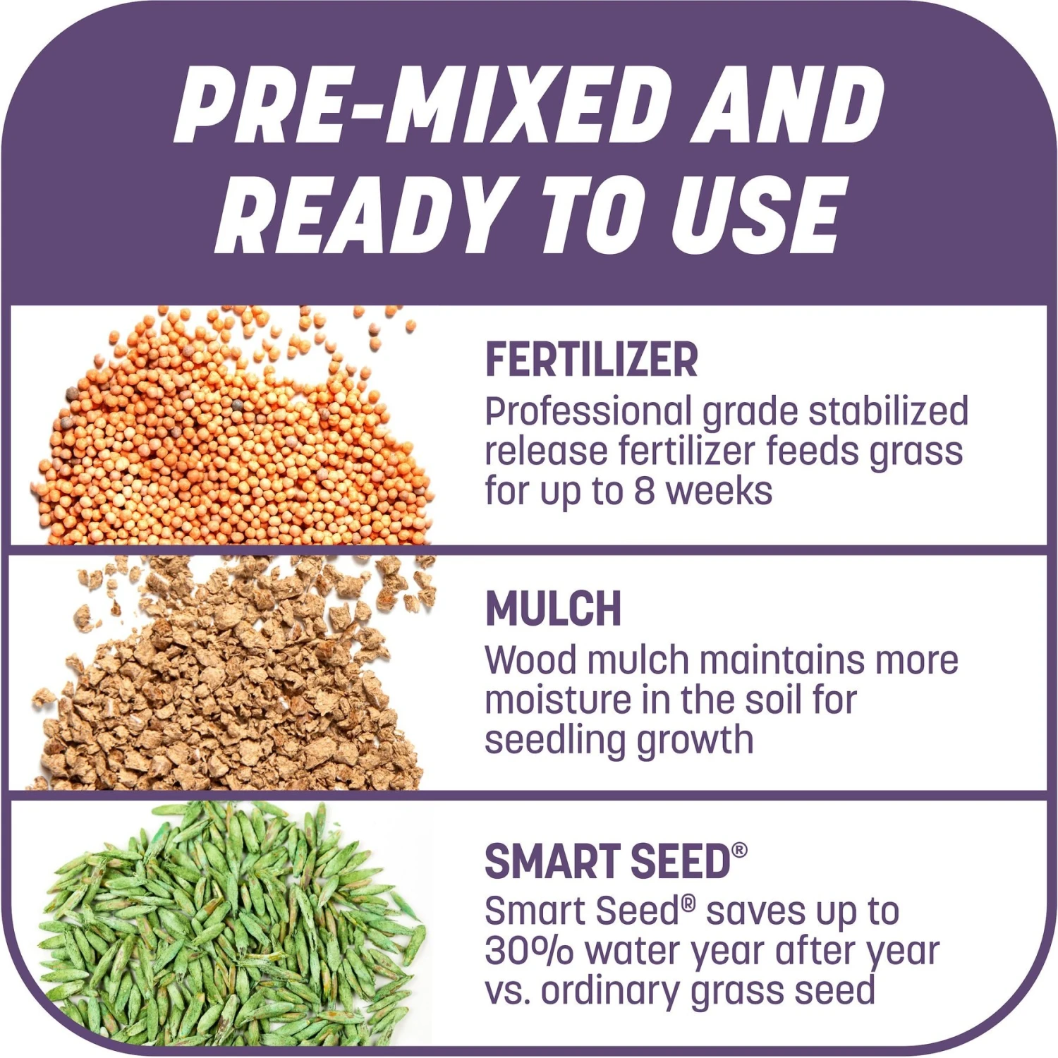 - Smart seed, fertilizer and mulch mix repairs bare spots in lawn and takes the guesswork out of lawn repairs.