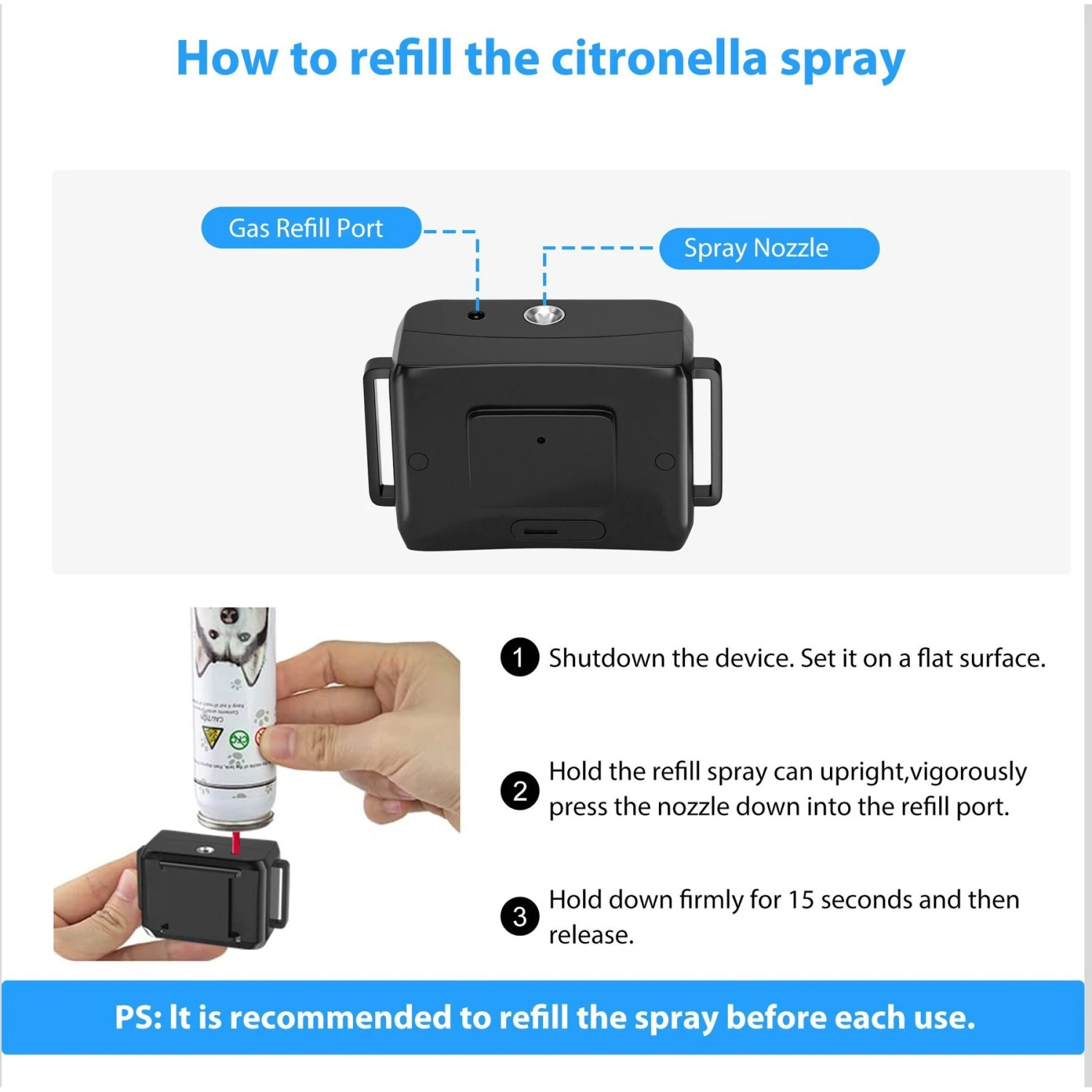 - Bark control collar automatically detects when your furbaby barks and emits a citronella spray burst to stop the behavior.