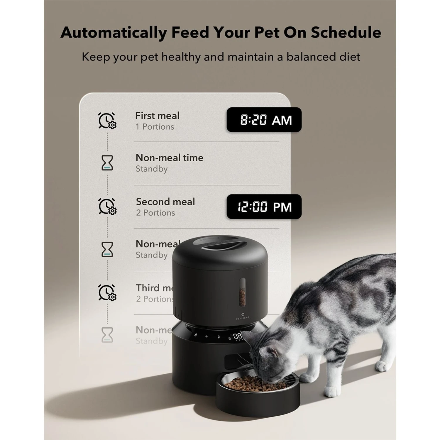 - Simply allot the time, meals and portions on the LCD screen—you can even record a personalized voice message to announce when it’s time to eat!