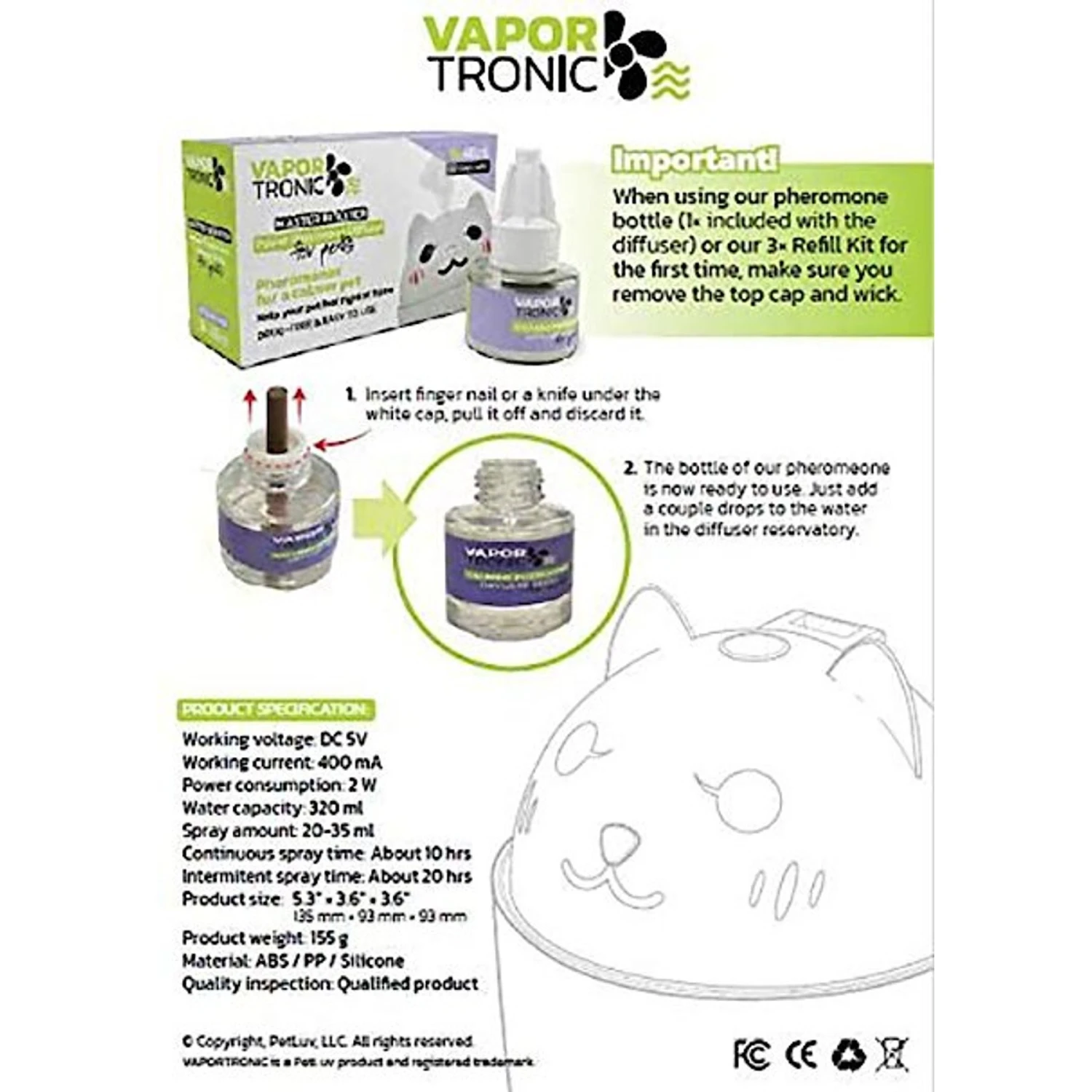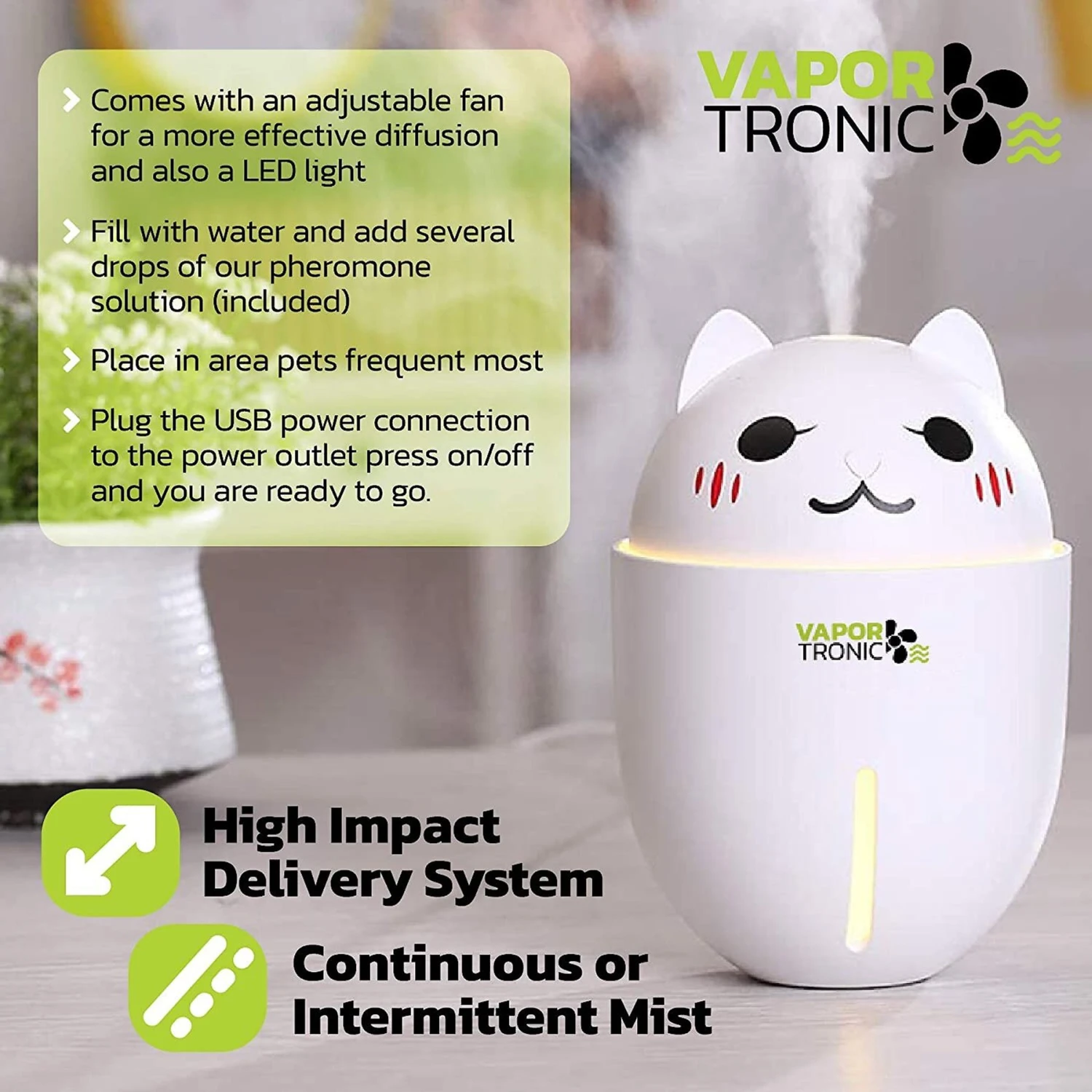 - The calming pheromones transform into a mist and the fan on top spreads it around the room. Simply plug the diffuser in a USB outlet and turn the power on.