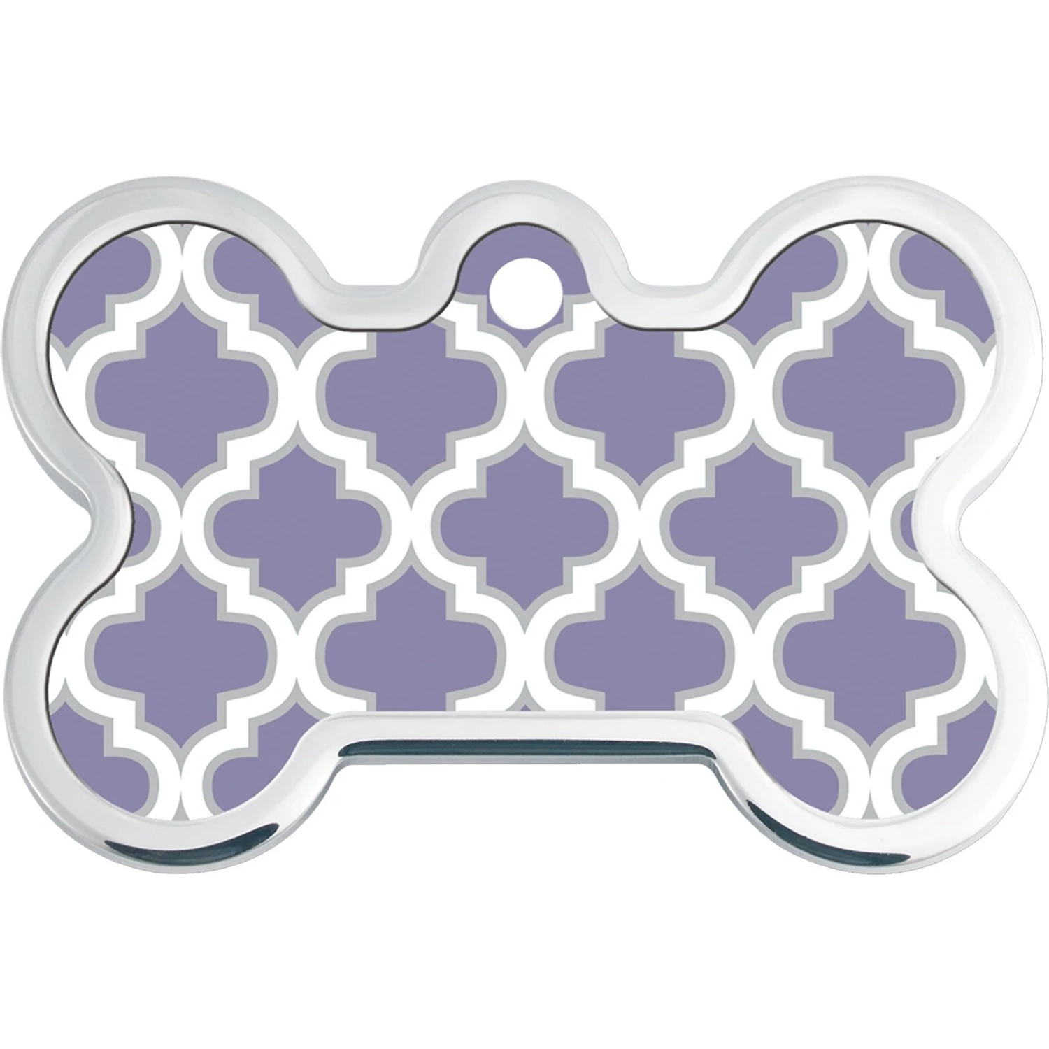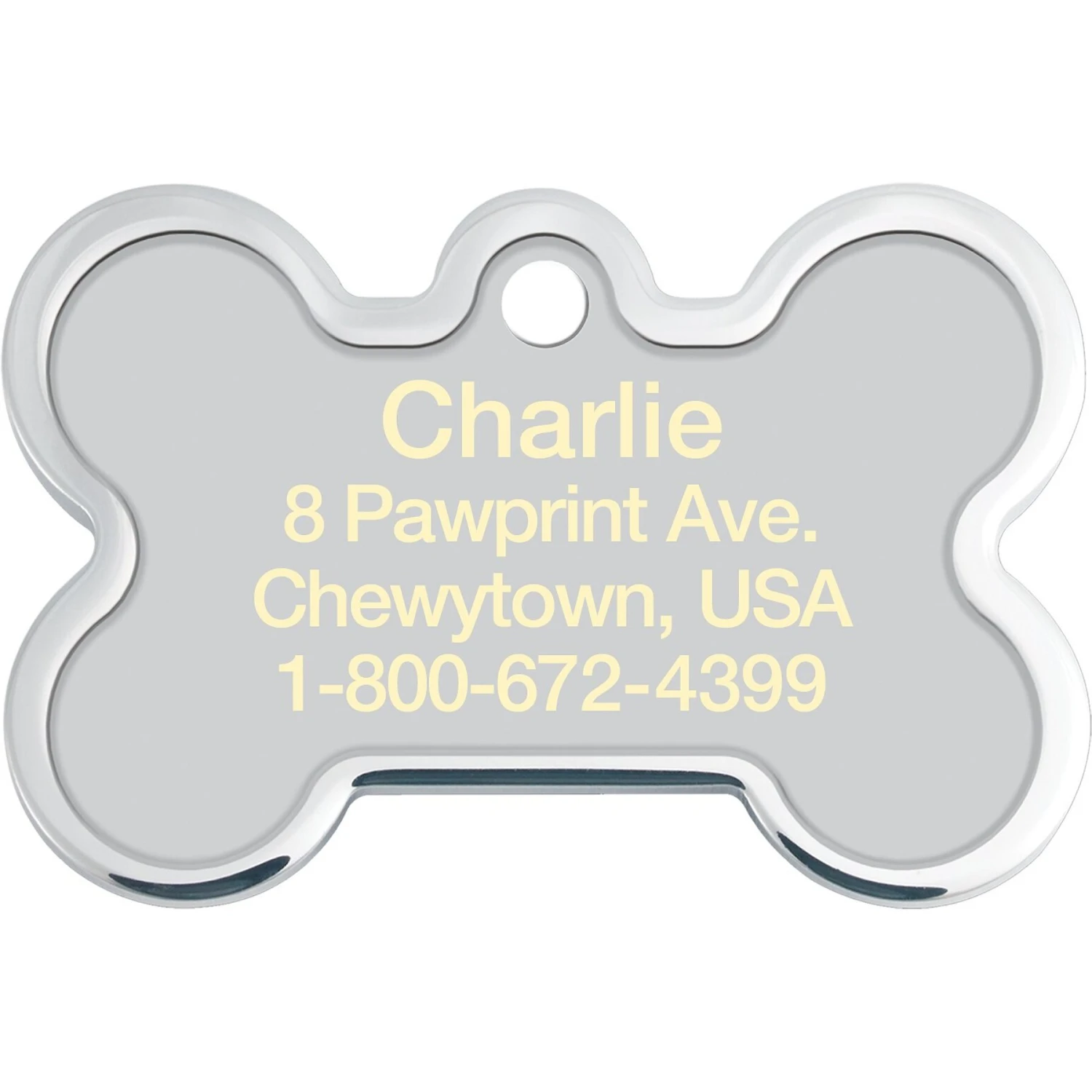 - Chrome-plated brass ID tag with decorative insert and raised edges.