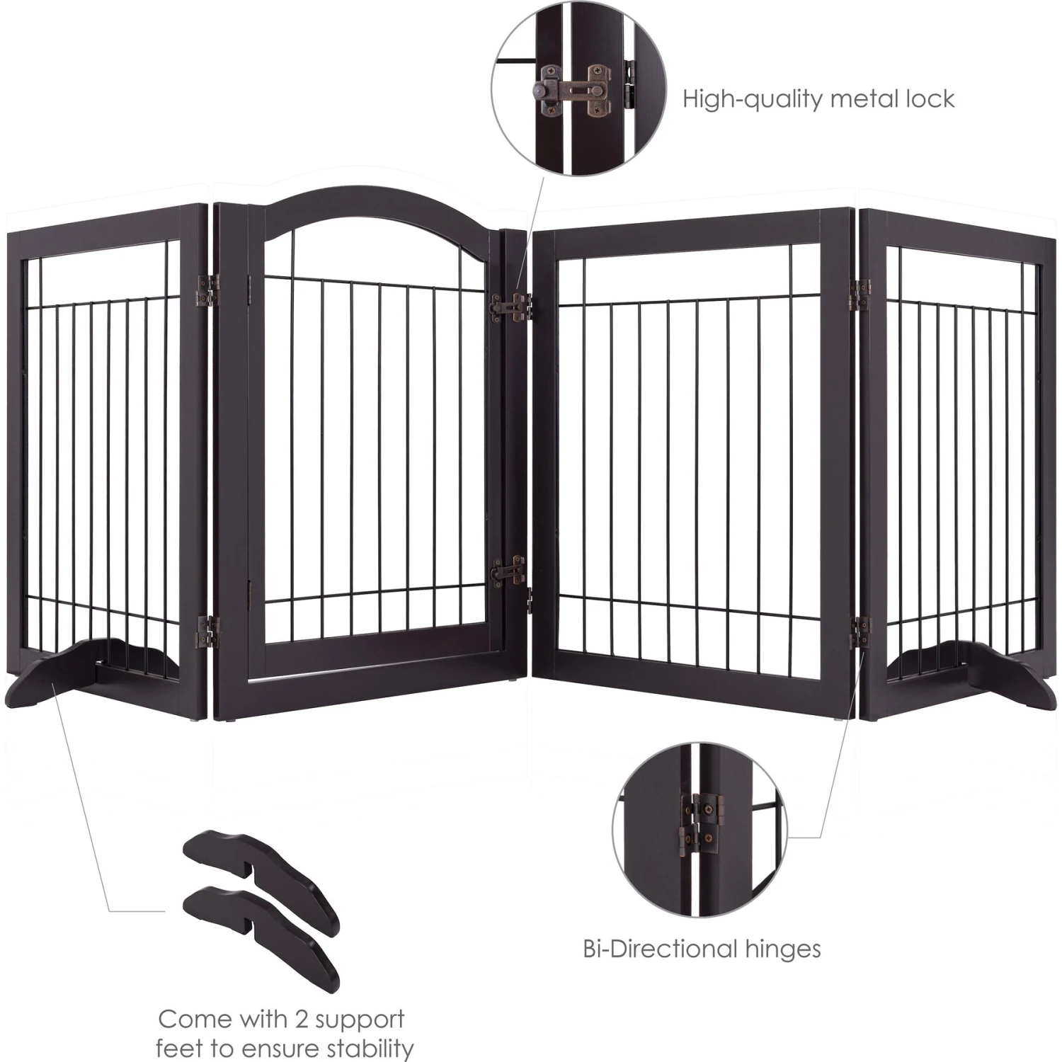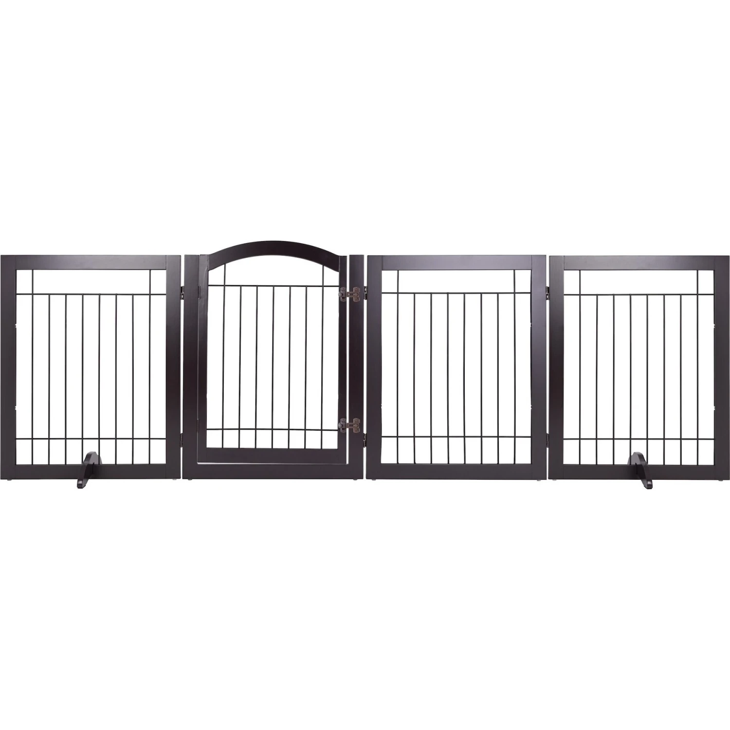 - This freestanding pet gate consists of four panels and does not require wall attachments.