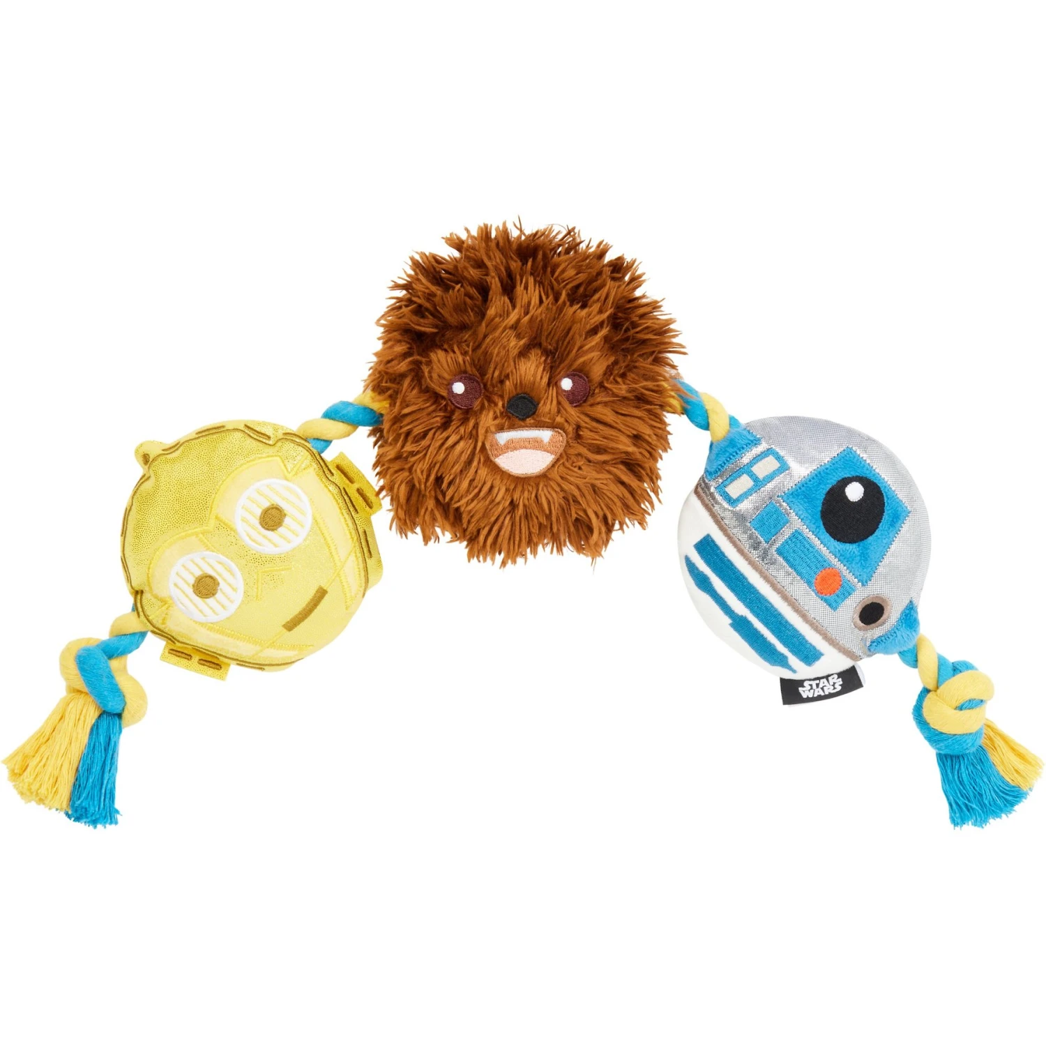 - Plush rope toy set features STAR WARS’ R2-D2, C-3PO and Chewbacca, each with a squeaker and connected by a rope.