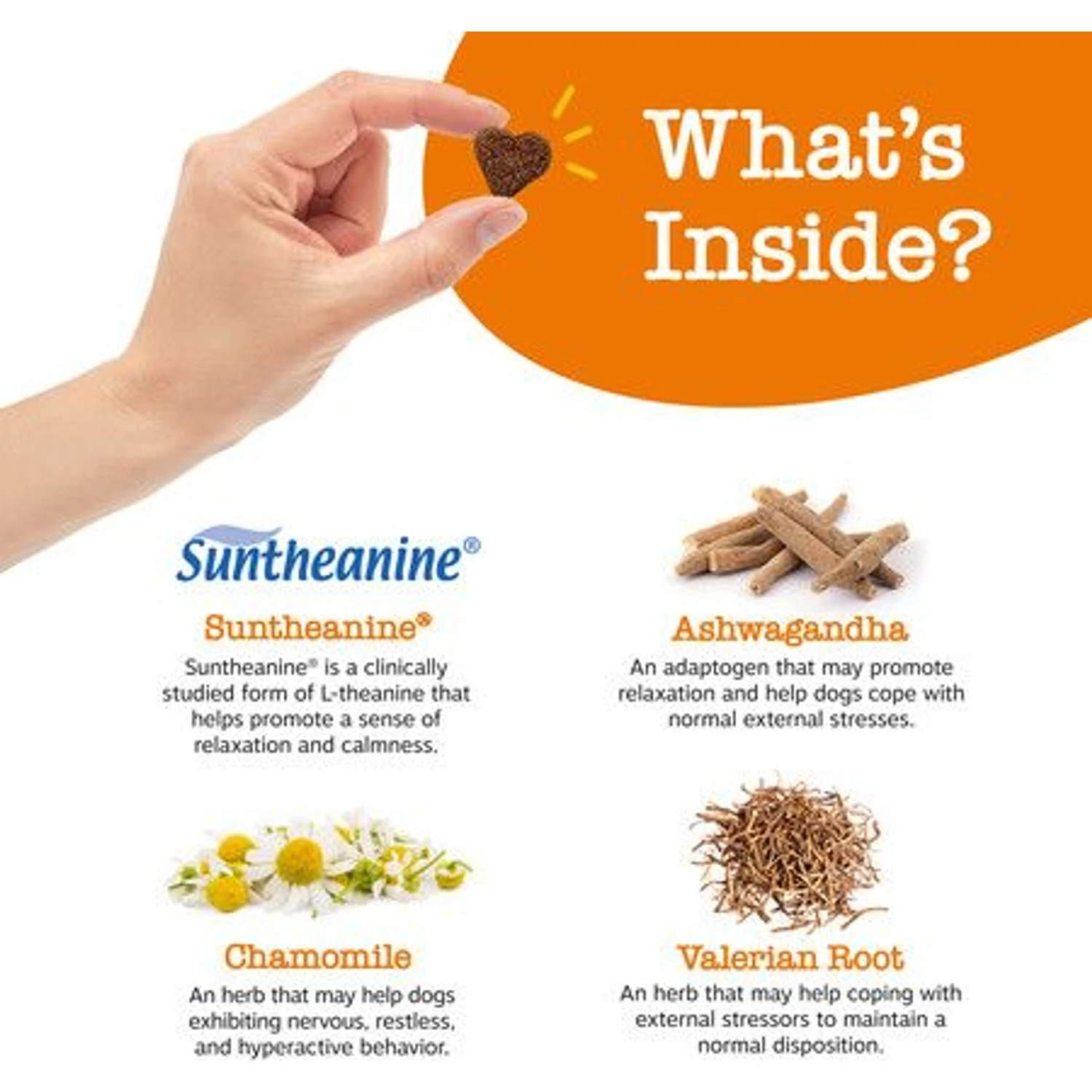 - Every chew contains Suntheanine, a clinically studied and super premium form of L-Theanine that helps promote a sense of relaxation and calmness for your pup.